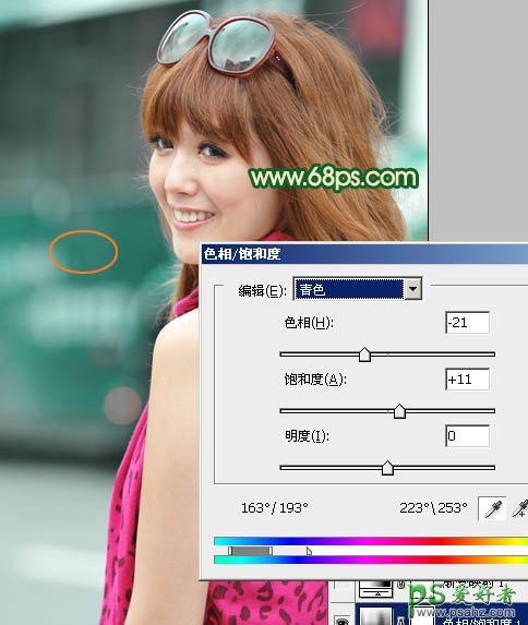3、创建色相/饱和度调整图层,选择青色,然后用吸管吸取红圈位置的颜色再调整,参数设置如图7,效果如图8。