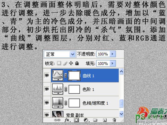 3、在调整画面整体明暗后,需要对整体颜色进行调整,进一步去除暖色成分,增加以蓝,青为主的冷色成分,并压暗画面的中间调部分,初步烘托出阴冷氛围。 添加曲线调整图层,分别对红,蓝,RGB通道进行调整,参数及效果如下图。
