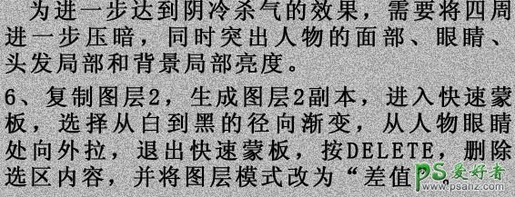 6、复制图层2,得到图层2副本,进入快速名呢过吧,选择从白到黑的径向渐变,从人物眼睛处向外拉,退出快速蒙版后按Delete 删除选区部分图片,并将图层混合模式改为“差值”,过程如下图。