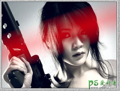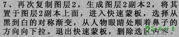 7、再次复制图层2,生成图层2副本2,将其置于图层2副本上面,进入快速蒙版,选择从黑到白的对称渐变,从人物眼睛处顺着鼻子的方向向下拉。退出快速蒙版,按Delete删除选区内容。