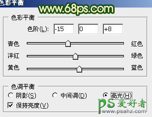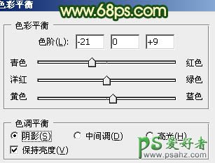 3、创建色彩平衡调整图层,对阴影,高光进行调整,参数设置如图4,5,效果如图6。
