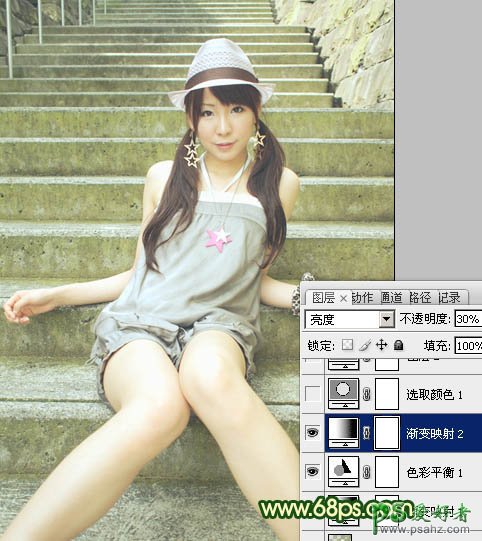 4、创建渐变映射调整图层,颜色设置如图7,确定后把图层混合模式改为“变亮”,不透明度改为:30%,效果如图8。