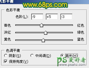 4、创建色彩平衡调整图层,对高光进行调整,参数设置如图12,效果如图13。