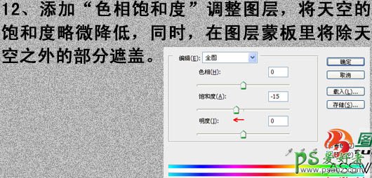 12、创建色相/饱和度调整图层,将天空的饱和度略微降低,同时在图层蒙版里将除天空之外的部分遮盖。