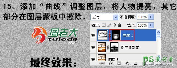 15、创建曲线调整图层,将人物提亮,其它部分在图层蒙版中擦除。