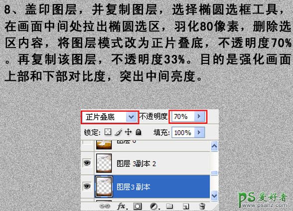 8、新建一个图层,盖印图层。并复制图层,选择椭圆选框工具在画面中间处拉出椭圆选区,羽化80像素,删除选区内容,将图层混合模式改为“正片叠底”,不透明度改为:70%。再复制该图层,不透明度改为:33%。目的是强化画面上部和下部对比度,突出中间亮度。
