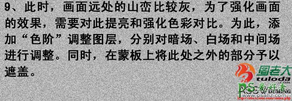 9、此时,画面远处的山峦比较灰,为了强化画面的效果,需要对此提亮和强化色彩对比。为此添加色阶调整图层,分别对暗场、白场合中间场进行调整。同时在蒙版上将此处之外的部分予以遮盖。