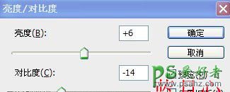 4、虽经过调整后色阶得以改善,但大部分色阶高耸在中间调部位,为缓解这种现象,接着进行亮度对比度调整,降低图像颜色对比度,如图所示。