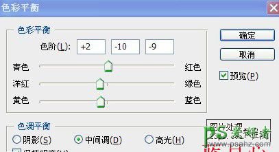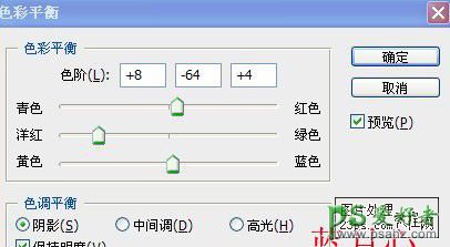 5、简单的较色之后,开始执行本教程主题,进行色调调整,打开色彩平衡调板,设置如图。到这里为止图像呈现出一种古典的紫色。