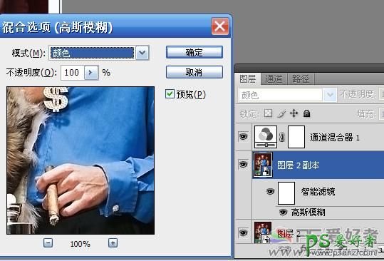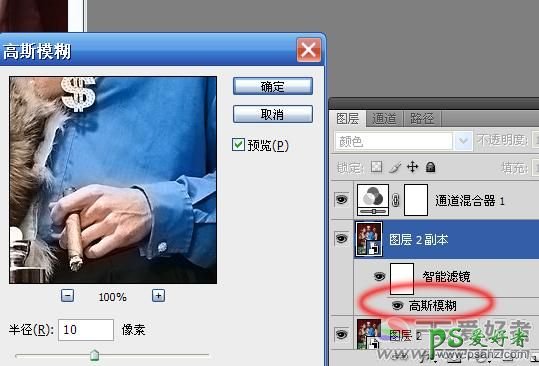 7、为什么要转换为智能对象呢?双击下图中的“高斯模糊”,这时候我们发现可以重新设定高斯模糊的值。 在CS4中,转换为智能对象之后,滤镜的数值可以任意调整,不影响图层本身的内容。