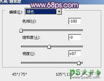 1、打开原图素材,创建色相/饱和度调整图层,选择绿色,用吸管吸取绿色背景颜色再调整,参数设置如图1,效果如图2。