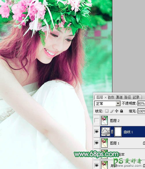 12、创建曲线调整图层,对b通道进行调整,参数设置如图28,确定后把图层不透明度改为:80%,效果如图29。
