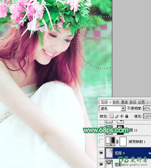 13、新建一个图层,盖印图层。选择菜单:图像 > 模式 > RGB颜色。确定后新建一个图层,图层混合模式改为“滤色”,把前景颜色设置为:#A43C6B,用画笔把下图选区位置涂上高光,适当降低图层不透明度,效果如下图。