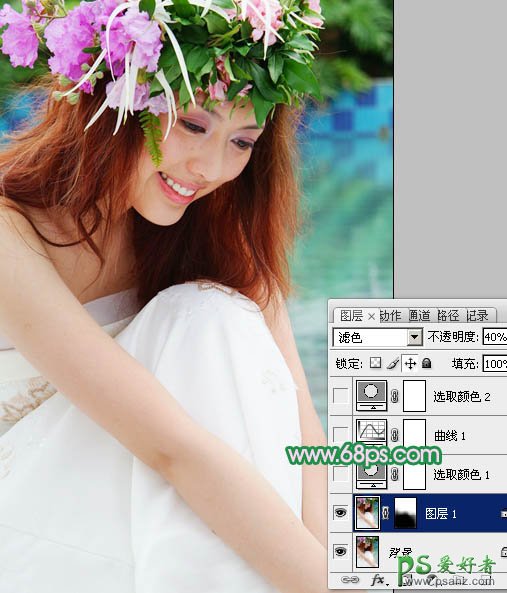 1、打开原图素材,按Ctrl + J 把背景图层复制一层,图层混合模式改为“滤色”,不透明度改为:40%,加上图层蒙版,用黑色画笔把下半部分擦出来,如下图。