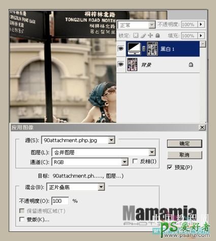 2、对这个黑白调整蒙版执行:图像 > 应用图像,设置如图。