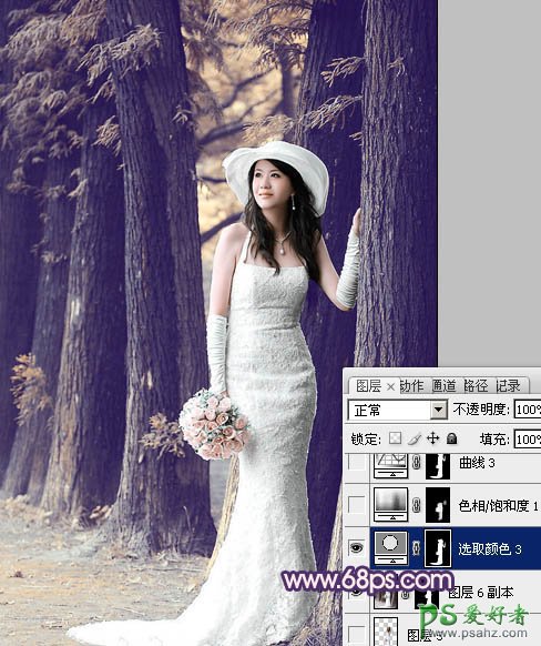 PS美女照片后期调色教程,photoshop调出经典蓝调树林少女写真图片,少女艺术照调色教程,蓝色婚片调色不太好把握,调成纯蓝色画面会很单调,需要在蓝色中加入一些补色,这样画面才会耐看。调色的时候可以先把图片处理成单色图片,然后慢慢加入其它