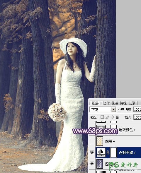PS美女照片后期调色教程,photoshop调出经典蓝调树林少女写真图片,少女艺术照调色教程,蓝色婚片调色不太好把握,调成纯蓝色画面会很单调,需要在蓝色中加入一些补色,这样画面才会耐看。调色的时候可以先把图片处理成单色图片,然后慢慢加入其它