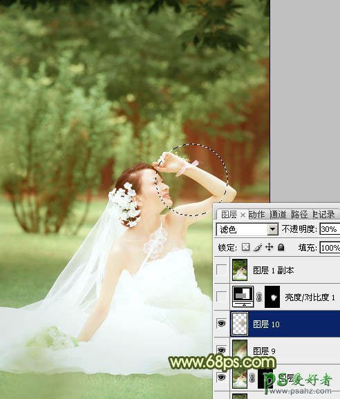 12、新建一个图层,图层混合模式改为“滤色”,把前景颜色设置为:#7B6917,用画笔涂抹下图选区部分,加上高光,可以适当降低图层不透明度,效果如下图。