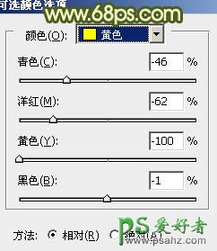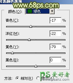 2、创建可选颜色调整图层,对黄,绿进行调整,参数设置如图4,5,效果如图6。