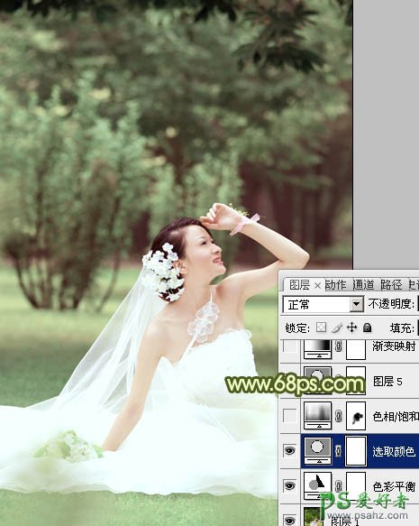 PS照片后期调色教程,photoshop调出甜美阳光色外景美女婚纱写真照,原图素材以绿色为主,调色的时候只需要把绿色稍微左一些调整,适当加亮背景。然后再把人物肤色调红润一点,整体看上去柔和,甜美即可。 最终效果 原图 1、打开原图素材,对