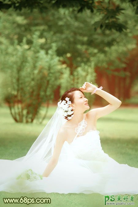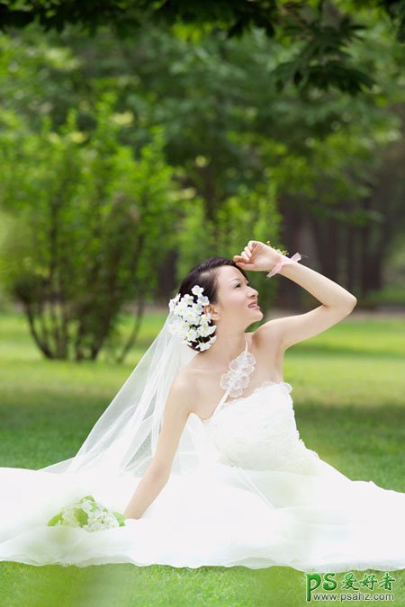 PS照片后期调色教程,photoshop调出甜美阳光色外景美女婚纱写真照,原图素材以绿色为主,调色的时候只需要把绿色稍微左一些调整,适当加亮背景。然后再把人物肤色调红润一点,整体看上去柔和,甜美即可。