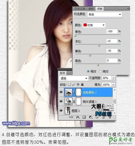4、创建可选颜色调整图层,对红色进行调整,参数设置如下图。确定后把图层混合模式改为“滤色”,不透明度改为:30%,效果如下图。