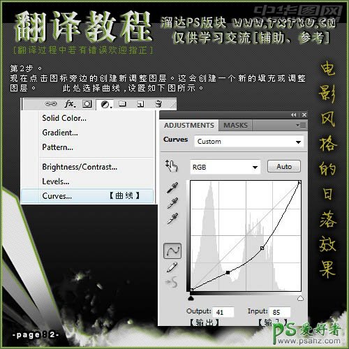 2、现在点击图标旁边的创建新调整图层。这会创建一个新的添加或调整图层,此处选择曲线,设置如下图所示。