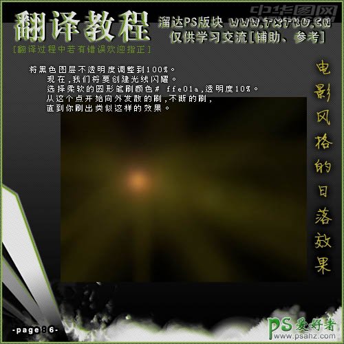 将黑色图层不透明度调整到100%。现在我们将要创建光线闪耀。选择柔软的圆形笔刷颜色:#ffe01a,透明度为:10%。从这个点开始向外发散的刷,不断的刷,知道你刷出类似下图所示的效果。