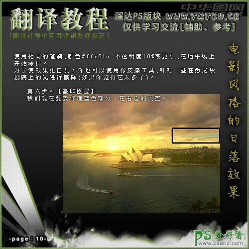 使用相同的笔刷,颜色:#ffe01a,不透明度为:10%左右,在地平线上开始涂抹。为了使效果更自然,你可以使用橡皮擦工具,针对主体建筑商的光进行擦除。 6、我们现在要去修复蓝色部分。