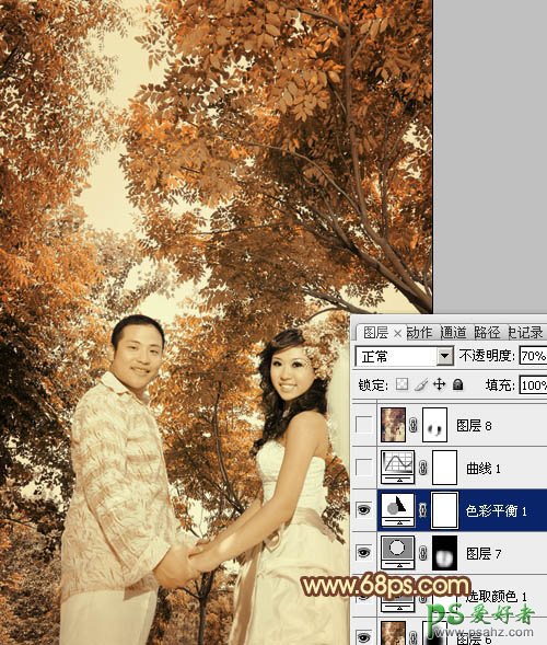 PS调色教程:给树林里的情侣婚纱照调出古典的色调