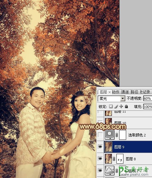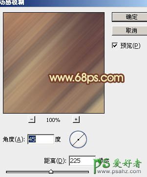 10、新建一个图层,盖印图层。执行:滤镜 > 模糊 > 动感模糊,参数设置如图19,确定后把图层混合模式改为“柔光”,不透明度改为:60%,效果如图20。