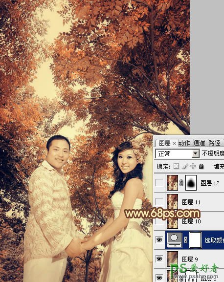 PS调色教程:给树林里的情侣婚纱照调出古典的色调