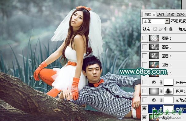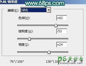 1、打开原图素材,创建色相/饱和度调整图层,选择绿色,用吸管吸取背景部分绿色再调整,参数设置如图1,效果如图2。这一步是快速给背景换色。