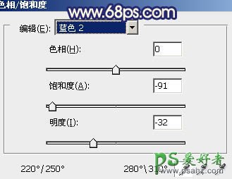 2、创建色相/饱和度调整图层,选择蓝色,用吸管吸取顶部云彩色调调整,参数设置如图4,效果如图5。