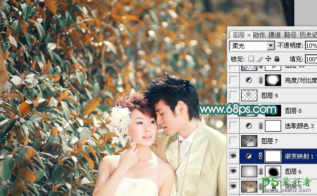 9、创建渐变映射调整图层,颜色设置如图18,确定后把图层混合模式改为“柔光”,不透明度改为:10%,效果如图19。