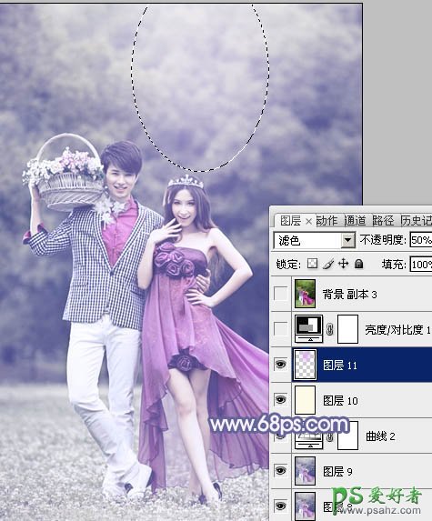 16、新建一个图层,图层混合模式改为“滤色”,不透明度改为:50%,把前景颜色设置为:#D8ADEE,用画笔把下图选区部分涂上高光。