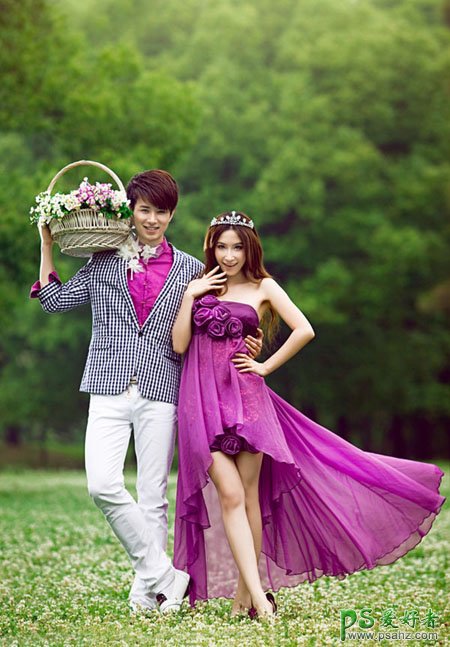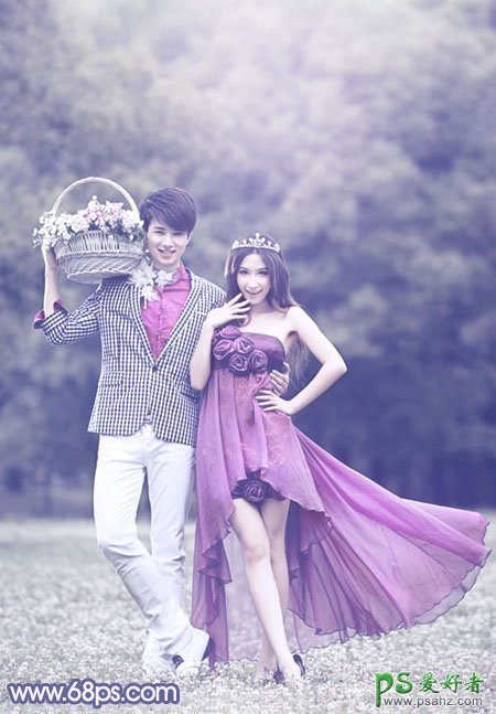 PS婚片后期调色教程,PS调色教程:给外景漂亮男女婚片调出淡淡的蓝紫色,本教程效果有点类似日韩的流行色。处理过程也比较简单。先用渐变映射及其他调色工具把画面的色调调亮,颜色减淡。然后分别把高光和暗调调成有一定对比的颜色即可。