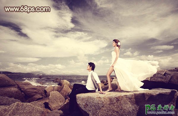 今天我们来学习一篇PS婚片后期调色教程,photoshop调出古典风格美腿玉足情侣婚片,本教程介绍黄褐色图片的调色方法。大致过程:处理之前需要把原图的饱和度降低,把画面做成类似中性色图片。然后用设置好的渐变映射等快速加上主色。后期加强一下层
