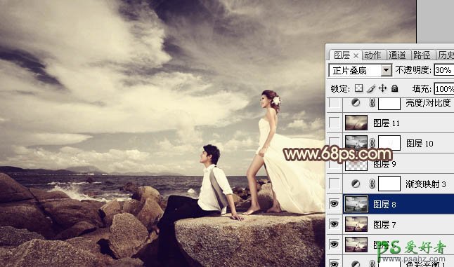 13、新建一个图层,盖印图层。按Ctrl + Shift + U 去色,图层混合模式改为“正片叠底”,不透明度改为:30%,效果如下图。