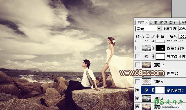 14、创建渐变映射调整图层,颜色设置如图24,确定后把图层混合模式改为“柔光”,不透明度改为:20%,效果如图25。