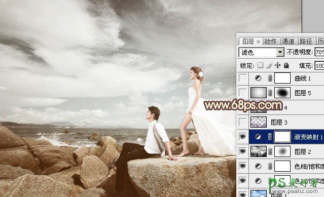 4、创建渐变映射调整图层,颜色设置如图6,确定后把图层混合模式改为“滤色”,不透明度改为:70%,效果如图7。