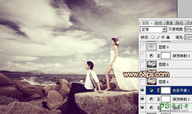 PS调色教程:给外景漂亮男女婚片调出淡淡的蓝紫色