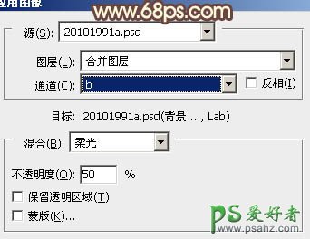 11、新建一个图层,盖印图层。选择菜单:图像 > 模式 > Lab颜色,选择不合拼。执行:图像 > 应用图像,参数设置如图19,效果如图20。