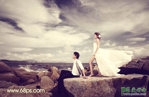 今天我们来学习一篇PS婚片后期调色教程,photoshop调出古典风格美腿玉足情侣婚片,本教程介绍黄褐色图片的调色方法。大致过程:处理之前需要把原图的饱和度降低,把画面做成类似中性色图片。然后用设置好的渐变映射等快速加上主色。后期加强一下层