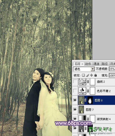 13、新建一个图层,盖印图层。图层混合模式改为“滤色”,不透明度改为:15%,按住Alt 键添加图层蒙版,用白色画笔把中间部分擦出来,效果如下图。