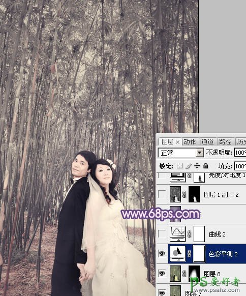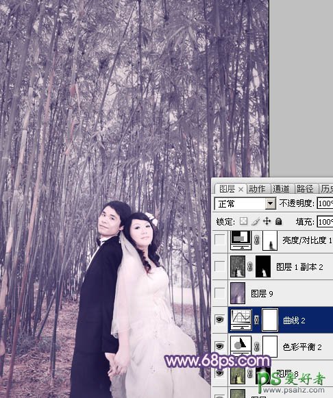 今天我们来学习一篇PS婚片后期调色教程,photoshop调出蓝紫色竹林里的情侣婚片,本教程介绍常见的单紫色图片的调色方法。大致过程:先加强一下图图片的整体层次和细节,人物部分可以适当润色处理。然后用色相/饱和度或渐变映射等快速把图片转为紫