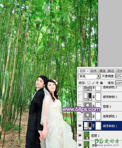 1、打开原图素材,创建渐变映射调整图层,颜色设置为黑白如图1,确定后把图层混合模式改为“变亮”,不透明度改为:30%,效果如图2。