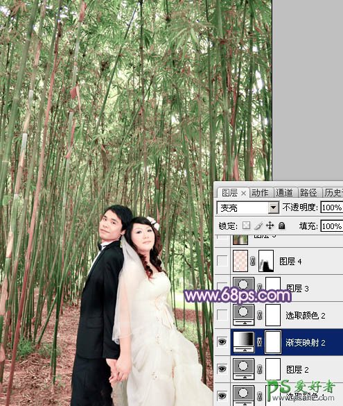 今天我们来学习一篇PS婚片后期调色教程,photoshop调出蓝紫色竹林里的情侣婚片,本教程介绍常见的单紫色图片的调色方法。大致过程:先加强一下图图片的整体层次和细节,人物部分可以适当润色处理。然后用色相/饱和度或渐变映射等快速把图片转为紫