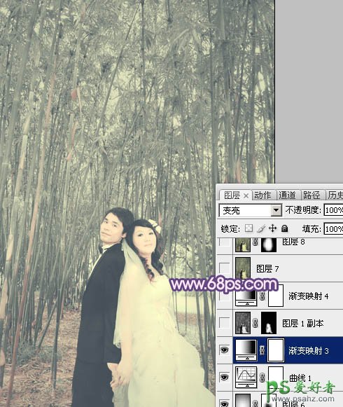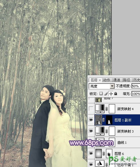 photoshop调出蓝紫色竹林里的情侣婚片