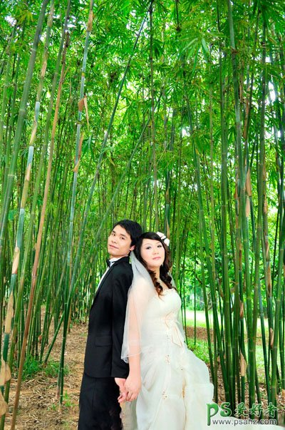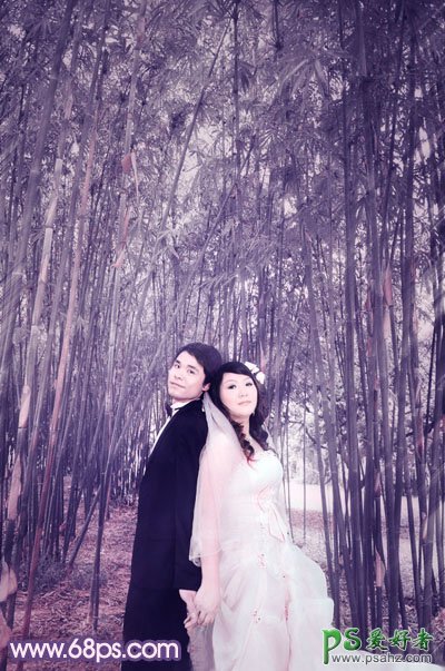 今天我们来学习一篇PS婚片后期调色教程,photoshop调出蓝紫色竹林里的情侣婚片,本教程介绍常见的单紫色图片的调色方法。大致过程:先加强一下图图片的整体层次和细节,人物部分可以适当润色处理。然后用色相/饱和度或渐变映射等快速把图片转为紫色,后期加上暗角,再适当调整细节即可。
